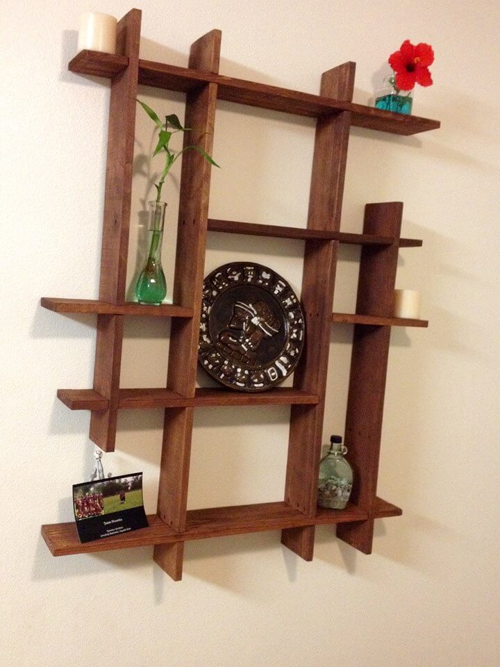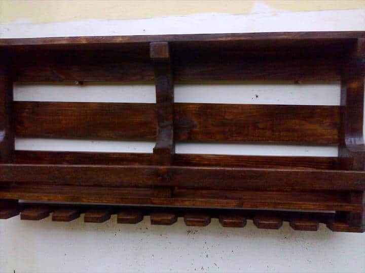 Essas prateleiras de paletes não são grandes e arrojadas, mas são muito suaves e sutis em suas formas e desenhos, e prenderiam admiravelmente suas peças de exposição como vasos de flores, molduras de fotos e velas etc. E a cereja no bolo é que a posse dessas prateleiras de aparência divertida não levaria muito do seu tempo, esforço e dinheiro. Você pode fazê-los instantaneamente e sem custo a partir das peças de ripas de paletes copiando a prateleira favorita entre as ideias de móveis para paletes. Pinte-os com tinta de parede ou matizes contrastantes para que possam contribuir de forma complementar para embelezar a sua casa.