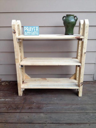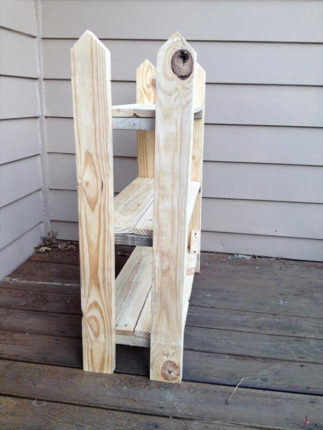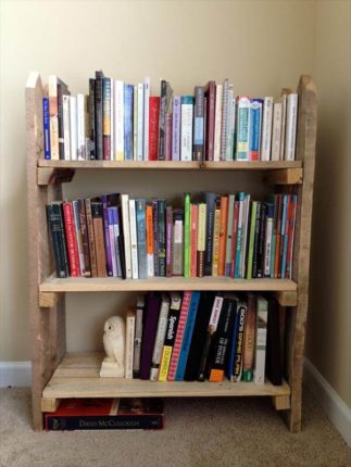 Adicionamos três prateleiras de paletes DIY a uma estrutura vertical de madeira para fazer um esquema de prateleiras de beliches triplas para o nosso modelo de estante. Lixamos a madeira a contento – como já ensinamos em postagens sobre como tratar a madeira de paletes antes da utilização – e até chegarmos naquela aparência perfeita de madeira com o brilho da natureza. Se for colorida, então seria mais bonito complementando mais ainda a sua aparência. Então obtenha-o na combinação ou padrão de cores desejado para complementar todo o layout da sala.
