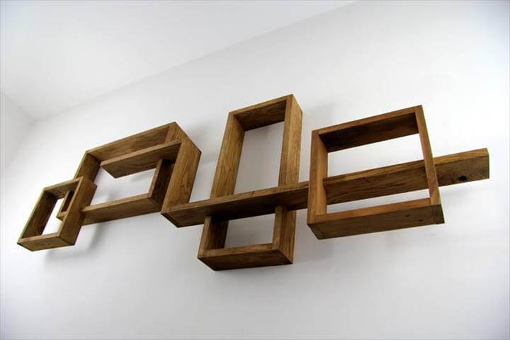 A aparência em estilo caixa faz com que as prateleiras sejam inspiradas nas modernas decorações geométricas das paredes interiores, que estão super em alta! Portanto, não há maneira melhor de imitar a moda moderna de interiores, basta tirar as taboas da palete para montar esta peça juntamente com algumas partes de paletes retas! Um pouco de pintura, coloração e verniz pode tornar estas prateleiras em outras completamente diferentes, com estilo artístico mais vibrantes e modernas!